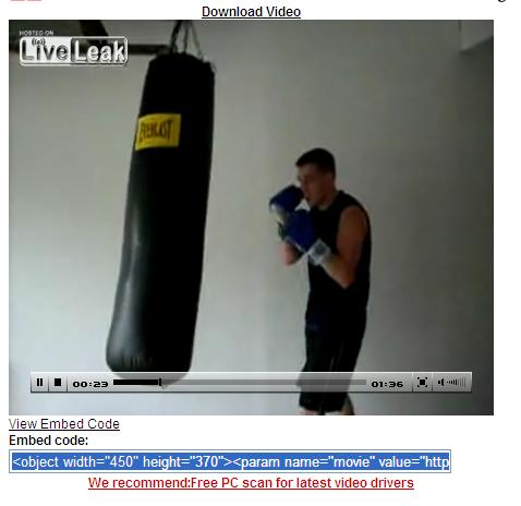 | Maintenant nous avons besoin de revenir à notre site Live Leak pour obtenir le code d'intégration (EMBED CODE). Sélectionnez la vidéo à lire en cliquant sur la vignette. Maintenant, sélectionnez le bouton Afficher le Code Embed directement dans la vidéo en cours. Quand le code apparait, cliquez dessus. Tout le texte à l'intérieur du champs est mis en évidence. Une nouvelle fois, vous appuyez et maintenez la touche |