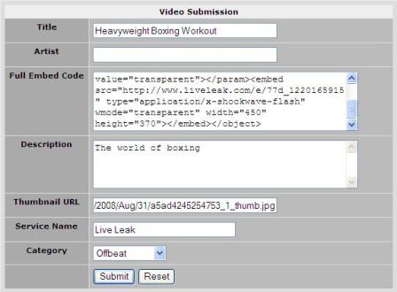 | La soumission manuelle nécessite un peu plus de travail parce que les fonctions automatiques ne sont pas disponibles. Vous devez visiter le site Web du Service de vidéos afin d'acquérir le code d'incorporation de la vidéo désirée, son titre, sa description et l'URL de la vignette vidéo. Par exemple, disons que nous voulons envoyer une vidéo qui apparaît sur Live Leak. Nous avons d'abord nous rendre sur http://www.liveleak.com et effectuer une recherche pour trouver une vidéo. |