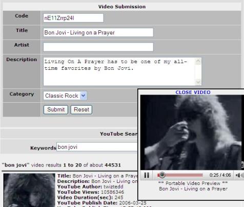 Vous pouvez rechercher sur YouTube, Daily Motion, MetaCafe et blip.tv, visualiser les vidéos et les soumettre sans quitter votre site. Quand vous sélectionnez l'un ou l'autre des modes de recherche du menu principal en dessous de Video Tube, voici à quoi ressemble le formulaire de soumission. Nota: L'exemple donné est pour YouTube. Les autres écrans de recheche peuvent varier quelque peu en apparence. Les autres services à coté de YouTube peuvent être ou ne pas être activés sur le site. |