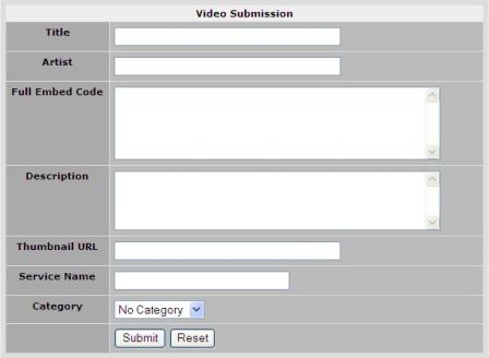 | Une autre option est disponible si vous souhaitez envoyer une vidéo à partir d'un service de vidéos autre que ceux déjà prévus dans les caractéristiques de recherche. Pour soumettre une vidéo manuellement sélectionnez Soumettre Manuellement à partir du menu principal sous Video Tube, et voici ce à quoi l'écran de soumission doit ressembler. |